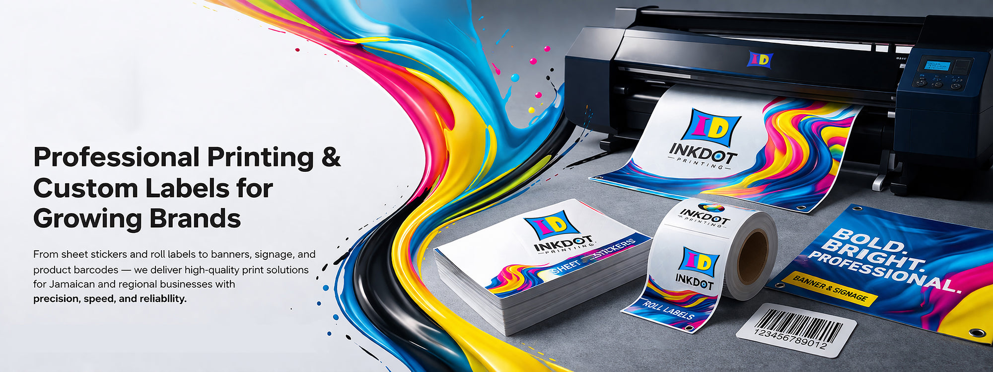 From sheet stickers and roll labels to banners, signage, business cards, poster cards and product barcodes — we help Jamaican and regional businesses bring their brands to life with precision printing and fast turnaround.